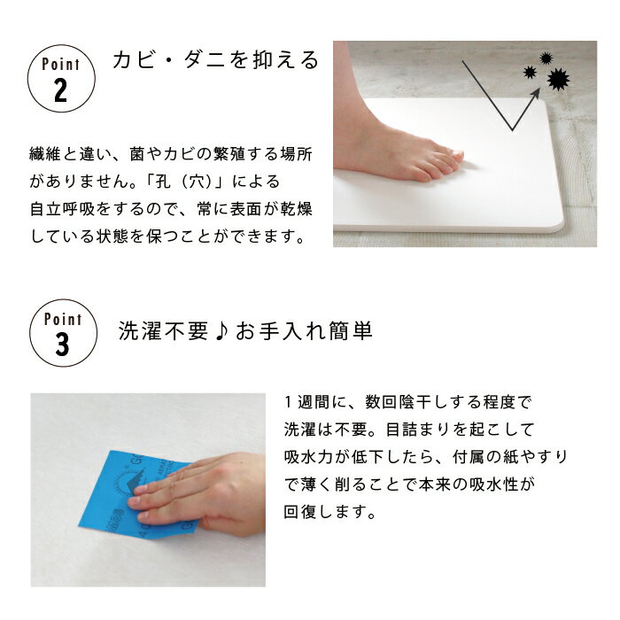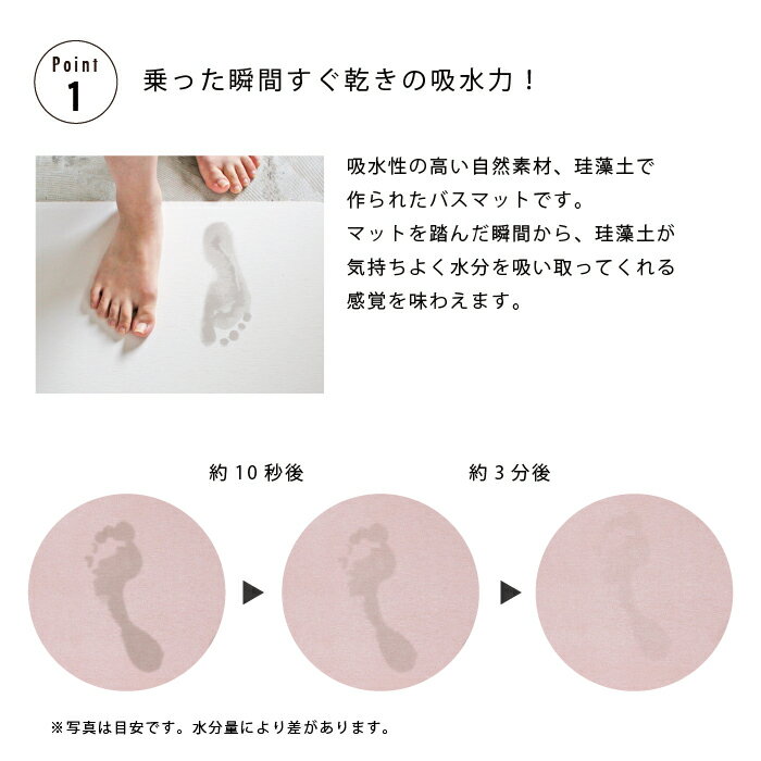 商品詳細 吸水性の高い自然素材、珪藻土(けいそうど)でつくられたバスマット。